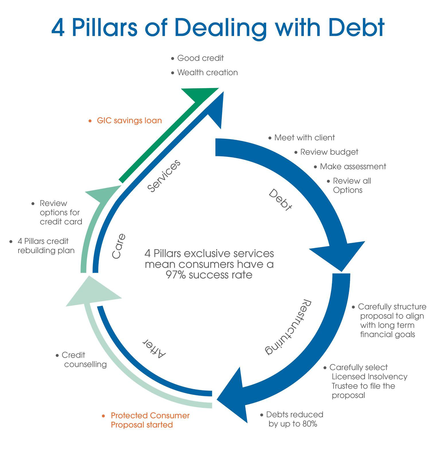 The 4 Pillars promise is to help get you out of debt today and never be a client again, with our Clients for Life® full circle opportunities.